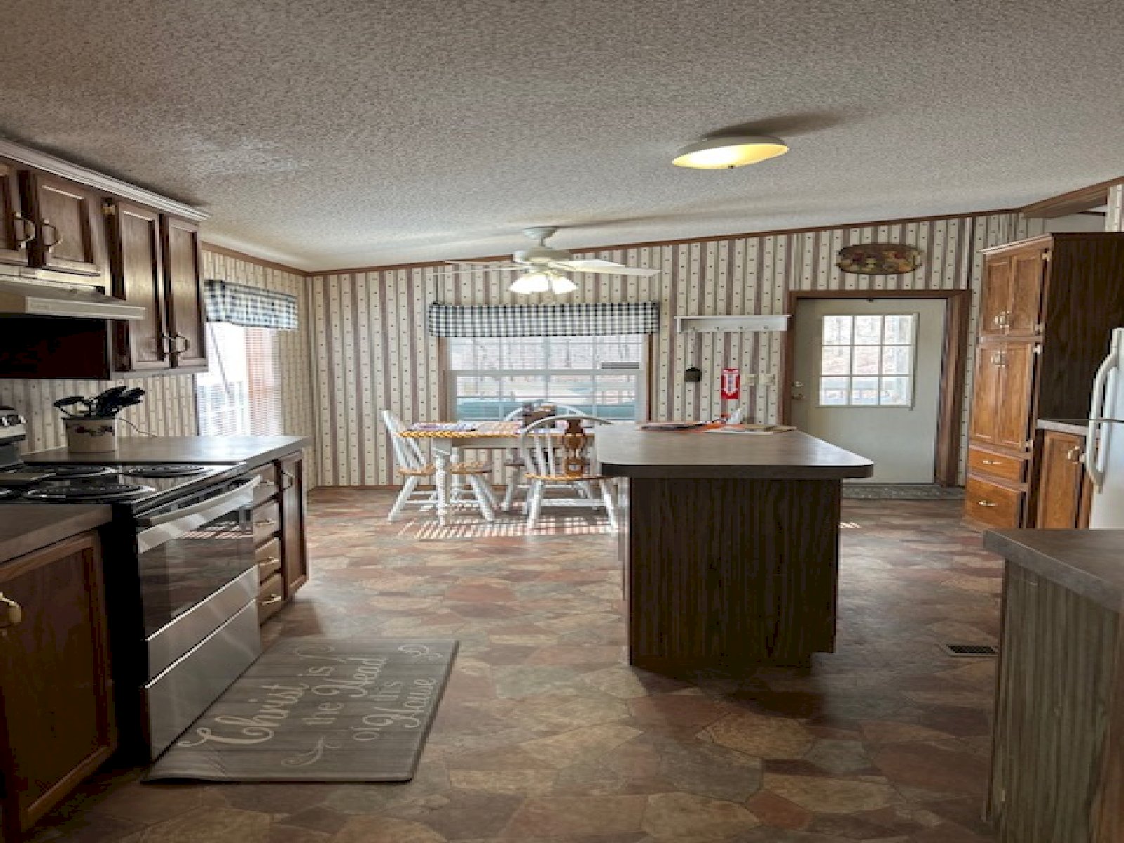 A very private, one story home with a large, partially covered, deck. It has a fully stocked kitchen, a master bathroom with shower/soaking tub combo, a full bathroom with tub/shower combo, fire ring, charcoal grill, gas fireplace.